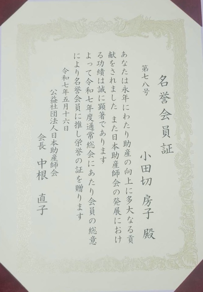 日本助産師会名誉会員証受賞 さいたま市地区会員の小田切房子さんが、日本助産師会より名誉会員証を受賞しました。おめでとうございます。以下、小田切さんより感謝のお言葉です。令和7年度日本助産師会総会において、第一号議案の名誉会員推薦(案)が認められ、私は「全員の総意により、名誉会員に推し栄誉の証を贈ります」と名誉会員証をいただきました。この賞は、埼玉県助産師会の皆さんと共のもので、嬉しく受賞時にお礼の挨拶で、本会への感謝の気持ちを伝えました。会員の皆さん本当におめでとうございます。これから社会は大きく変化するのではないかと案じられておりますが、これからも、助産師の役割は大切にされて、助産師職はいっそう社会に根付いて行かれますよう願っております。 投稿ナビゲーション 2025年7月「育児体験セミナー」開催します日本助産師会会長表彰